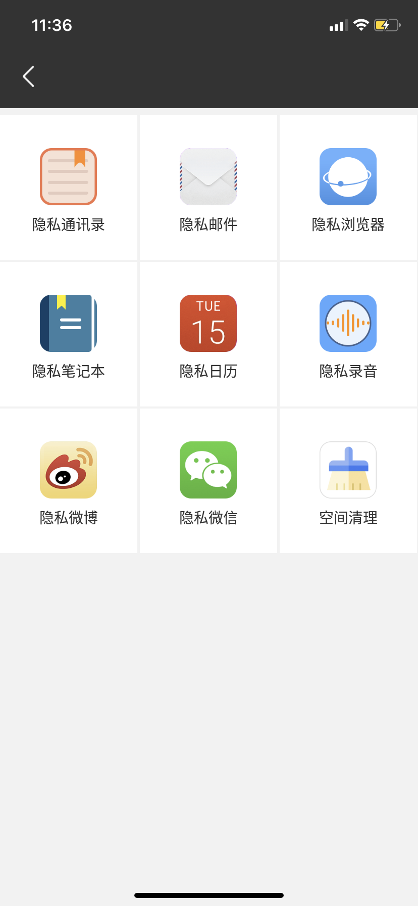 然后,点击主页中“更多隐私功能”可进入云端隐私空间界面,可以使用隐私通讯录,隐私邮件,隐私浏览器,隐私笔记本,隐私日历,隐私录音,隐私微博等功能。